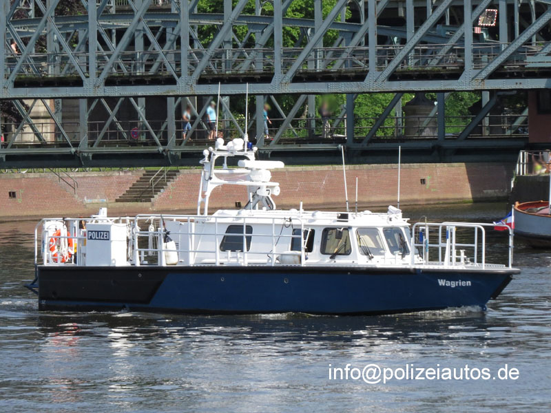 | Beschreibung: | Streifenboot der Wasserschutzpolizei Schleswig-Holstein, WSP-Station Lübeck-Travemünde. Technische Daten Bauwerft: Marine Alutech OY AB, Teijo, Finnland Schiffstyp: Watercat 1100 P Länge:12 m Breite: 3,4 m Tiefgang: 1 m Verdrängung: 8 t Motorisierung:2 x Volvo Penta D4 mit je 191 kw / 260PS Das Streifenboot wird auf der Trave und dem Elbe-Lübeck-Kanal im Zuständigkeitsbereich der Wasserschutzpolizeistationen Lübeck und Mölln eingesetzt. Fotos: Olaf Schulz |