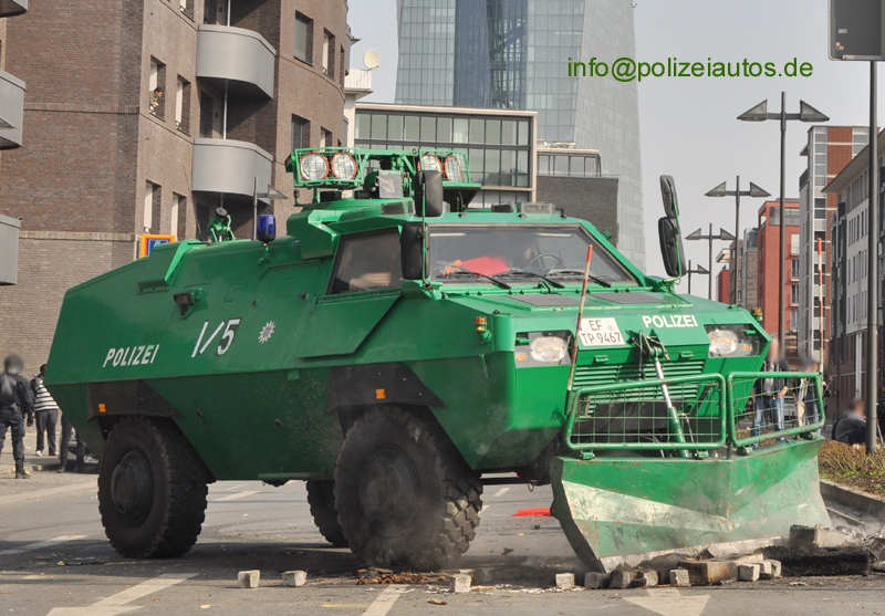 Sonderwagen SW 4 der Bereitschaftspolizei Thüringen im Blockupy-Einsatz, im März 2015, in Frankfurt/Main.