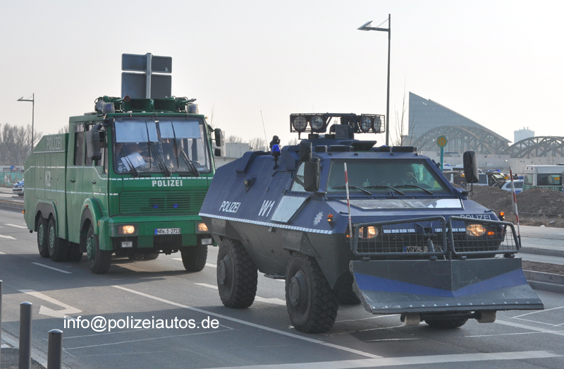 | Beschreibung: | Sonderwagen SW 4 W1 und Wasserwerfer K2 der Polizei NRW bei den Blockupy-Protesttagen im März 2015 in Frankfurt/Main. Der Wasserwerfer 9000, Aufbau Mercedes-Benz 2628, wurde nachträglich mit Reflexstreifen versehen, wobei sich die Linienführung auf dem Führerhaus gegenüber der 2634-Wawe-Ausführung und HIER unterscheidet. Die Polizei-Schriftzüge auf Tank und Führerhaus sind ebenfalls anders angeordnet/ausgeführt. Fotos: Gottung |