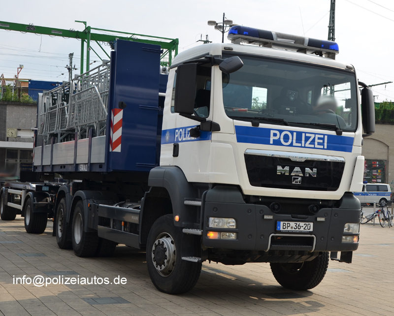 | Beschreibung: | Wechselladerfahrzeug (WLF) der Bundespolizei mit austauschbarem Ladungsträger (ATL), der hier mit Hamburger Gittern beladen ist. |