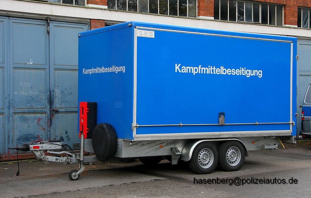| Beschreibung: | Anhänger des Kampfmittelbeseitigungsdienst Niedersachsen. In diesem Anhänger wird eine Wasserstrahlschneidanlage zum heraustrennen von Zündmechanismen aus Kampfmittelblindgängern transportiert. Das heraustrennen erfolgt mit einem Wasserstrahl der mit 700bar auf den Stahlkörper auftrifft. Datenblatt Auf Bild 4 sieht man einen Teil der verlasteten Anlage. |