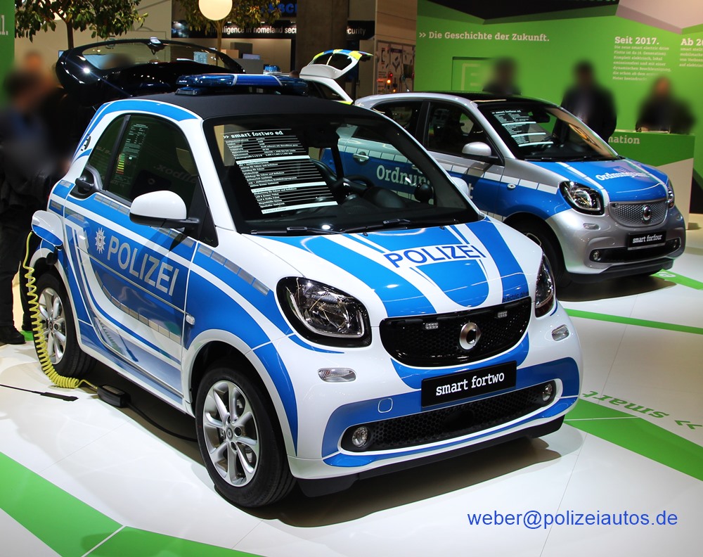 Smart Fortwo ed (electric drive) im Polizeidesgin, ausgestellt auf der GPEC 2018.