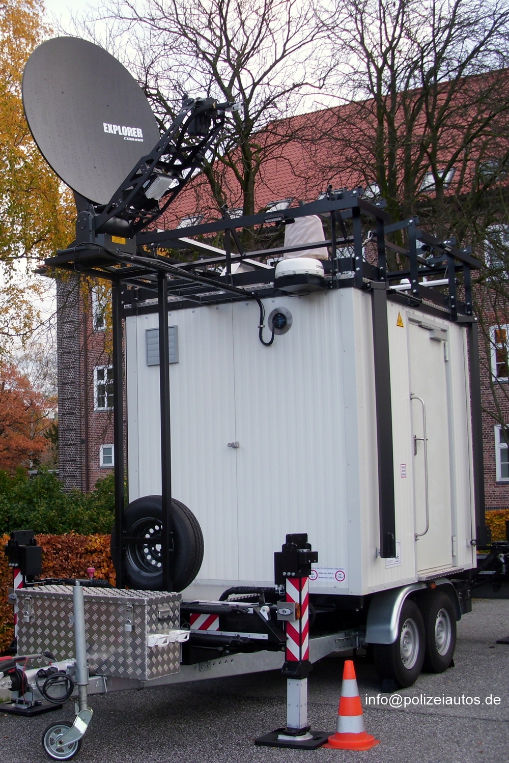 | Beschreibung: | Anhänger der Polizei Hamburg mit satellitenangebundener Basisstation (Sat-mBS) für den BOS-Digitalfunk . Technische Daten: Hersteller: Schwan Stahl- und Metallbau Bezeichnung: Mobile Antennenanlage 3,5t Typ: mrt20-mk3 aut. Baujahr: 2017 Fotos: I. Kröning |