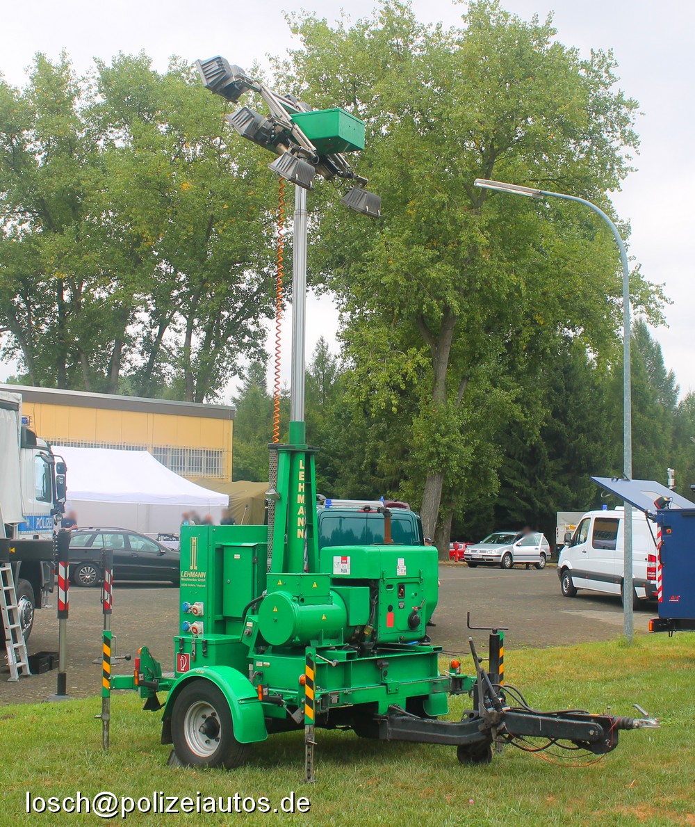| Beschreibung: | 1-achs. Lichtmastanhänger zur Ausleuchtung von Einsatzräumen. Technische Daten: 6 Strahler a 1500 Watt, auf 9,5m ausfahrbar. Der Anhänger wurde aus dem Bestand der Bereitschaftspolizei Baden- Württemberg übernommen, die weiße Kennung "21" links unterhalb der Verglasung des Bedienfeldes (Bild 3) deutet noch auf seine Ursprüngliche Herkunft hin. |
