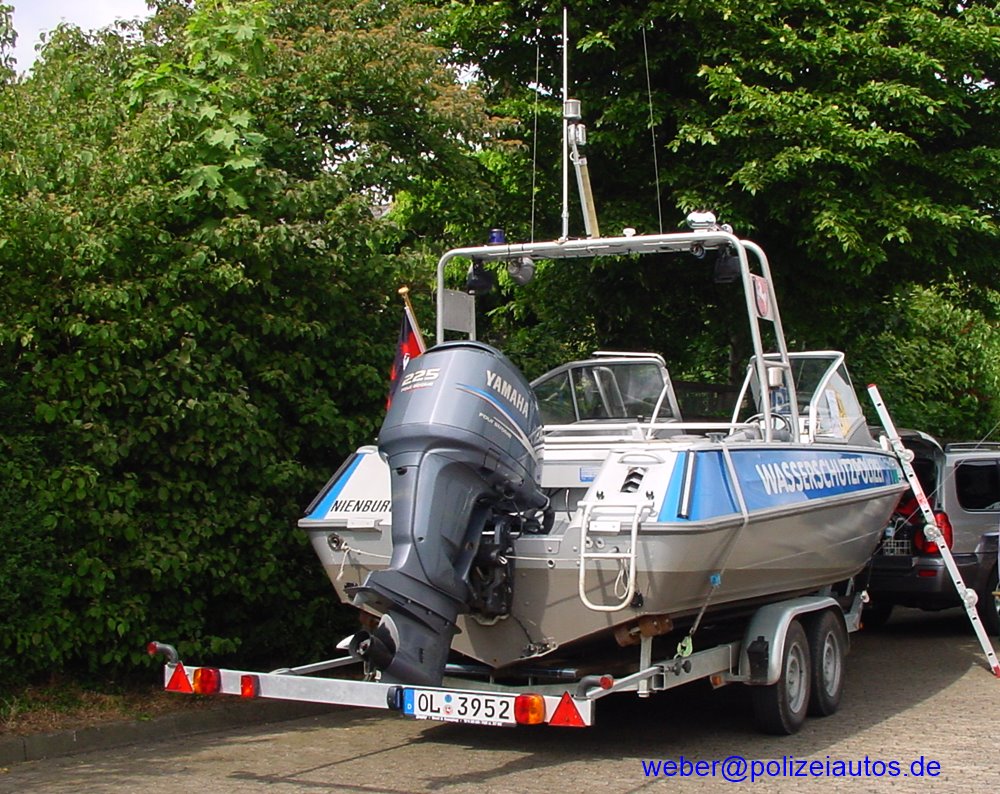 | Beschreibung: | Trailerbares Polizeistreifenboot W34 der WSP Niedersachsen, Heimathafen Nienburg. Technische Daten zum Boot: Bootstyp: Streifenboot (trailerbar) Bauart: Gleiter – Knickspantbauweise Baustoff Bootskörper: Marinealuminium Aufbauten: Cabrio Verdeck Baujahr: 2003 Bauwerft: FISKARS (Finnland) Länge ü.alles (m): 6,70 Länge Wasserlinie (m): 5,65 Breite ü.alles (m): 2,40 Breite Wasserlinie (m): 1,83 Gewicht Kg: 880 (ohne Zuladung und Motor) Tiefgang (m): 0,36 Verdrängung in t.: 0,88 Personen/Tragfähigkeit (Kg): 8/600 Kraftstofftank: 170 l Antrieb: Motortyp: Außenbordmotor Yamaha, F 225 AETX, 6 Zylinder kW/PS: 165 Kw/225 PS bei 5000UpM Antriebsart: Viertakt Einspritzer (Ottokraftstoff) Motorgewicht: 272 kg Höchstgeschwindigkeit: 50kn/ 90km/h. Ausrüstung: Echolot (Lowrance x125), GPS (Furuno GP-32), Polizeifunk (2m u. 4m), Schiffsfunk (UKW und Seefunkdienst) elektrische- u. Handlenzpumpe, Eberspächer Standheizung, Feuerlöscher, Digitaler Drehzahlmesser (u. a. mit Trimmanzeige, Betriebsstundenzähler), digitaler Geschwindigkeitsmesser (u.a. mit Kraftstoffanzeiger), Landanschluß, Kommandoanlage, Geräteträger (Scheinwerfer, Blaulicht, Lautsprecher, Funkantennen u.a.) Einsatzgebiet: Mittelweser, Aller, Hamme, Dümmer See. Sondereinsätze erfolgten bereits auf der Nord- und Ostsee. |